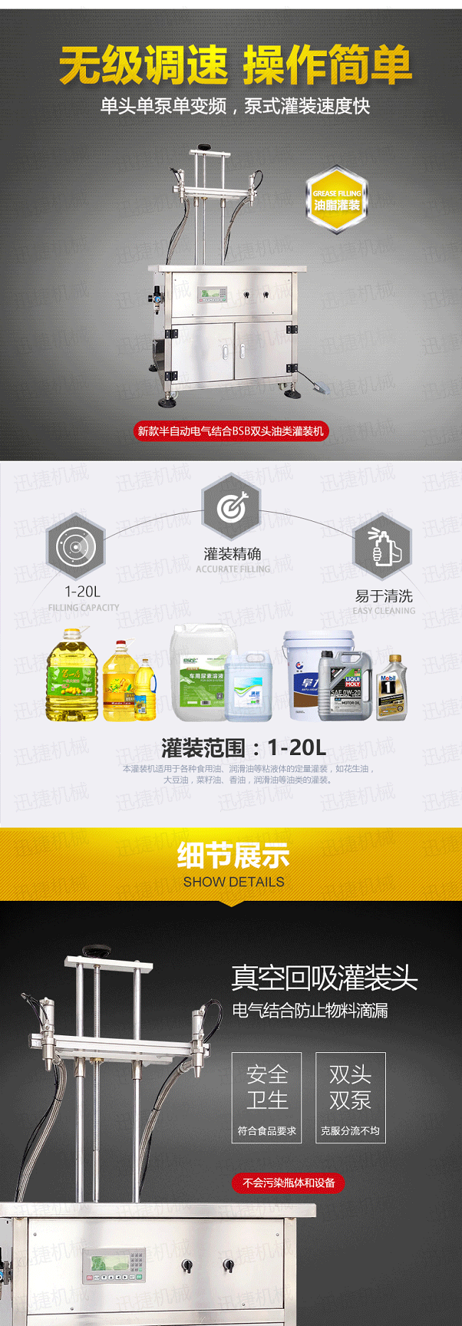 半自動(dòng)食用油灌裝機(jī)適用于各種食用油、潤滑油等粘液體的定量灌裝,如花生油,大豆油,菜籽油、香油,潤滑油等油類的灌裝。采用先進(jìn)的定量灌裝技術(shù),結(jié)合微電子智能控制技術(shù)單頭單變頻控制系統(tǒng),實(shí)現(xiàn)高精度、無級(jí)調(diào)速,操作簡(jiǎn)單。各個(gè)灌裝頭可在一定范圍內(nèi)任意調(diào)節(jié)間距和灌裝量,可使用各種大小形狀的容器的灌裝。自動(dòng)化程度高。另外,機(jī)身零件采用優(yōu)質(zhì)不銹鋼制造,即耐用又衛(wèi)生,長時(shí)間工作性能可靠穩(wěn)定。達(dá)到GMP衛(wèi)生要求。本公司產(chǎn)品通過了IS9000質(zhì)量體系認(rèn)證。本設(shè)備經(jīng)久耐用,性能穩(wěn)定,是食用油、潤滑油等行業(yè)理想的灌裝設(shè)備。