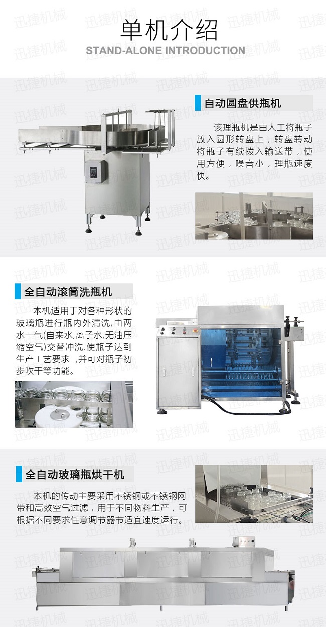 自動供瓶機(jī)+全自動滾筒洗瓶機(jī)+自動六米烘干機(jī)+自動收瓶機(jī)+全自動六頭灌裝機(jī)自動灌裝+全自動提蓋機(jī)自動理蓋、提蓋、掛蓋+六頭真空旋蓋機(jī)同時六個頭真空旋蓋+套標(biāo)機(jī)+收縮機(jī)+圓瓶貼標(biāo)機(jī)+整理平臺;