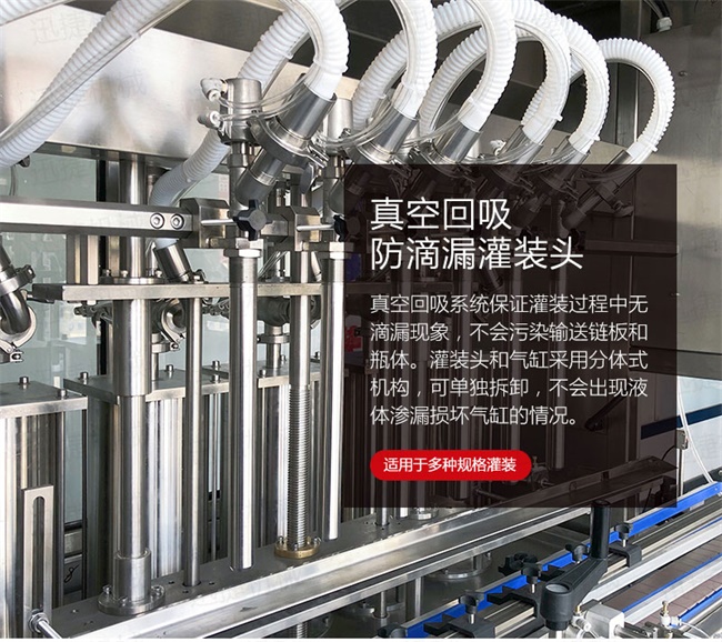 1.真空回吸系統(tǒng)保證灌裝過(guò)程中無(wú)滴漏現(xiàn)象,不會(huì)污染輸送鏈板和瓶體。灌裝頭和氣缸采用分體式機(jī)構(gòu),可單獨(dú)拆卸,不會(huì)出現(xiàn)液體滲漏損壞氣缸的情況。進(jìn)口亞德客氣缸經(jīng)久耐用,其他密封等配件使用標(biāo)準(zhǔn)件,更換維護(hù)簡(jiǎn)單方便。