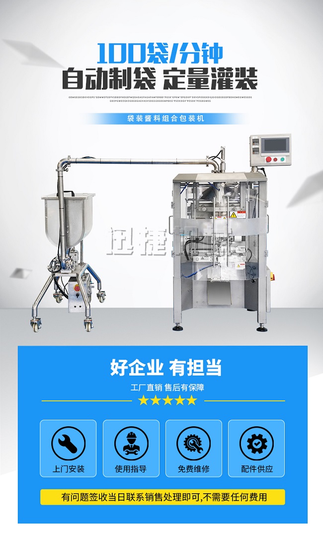 本機器主要用于調味品醬料的自動化包裝,機器安裝有橫向螺帶式攪拌,使油醬混合均勻,確保灌裝精度和產品包裝成品的均勻性。灌裝計量設備安裝有萬向輪,管路鏈接均采用快拆接頭,方便灌裝機拆卸移動清洗。包裝設備采用全伺服驅動器,包裝速度快,運行穩定。設備構成組件:攪拌式定量灌裝機一臺管道鏈接組件2米。
