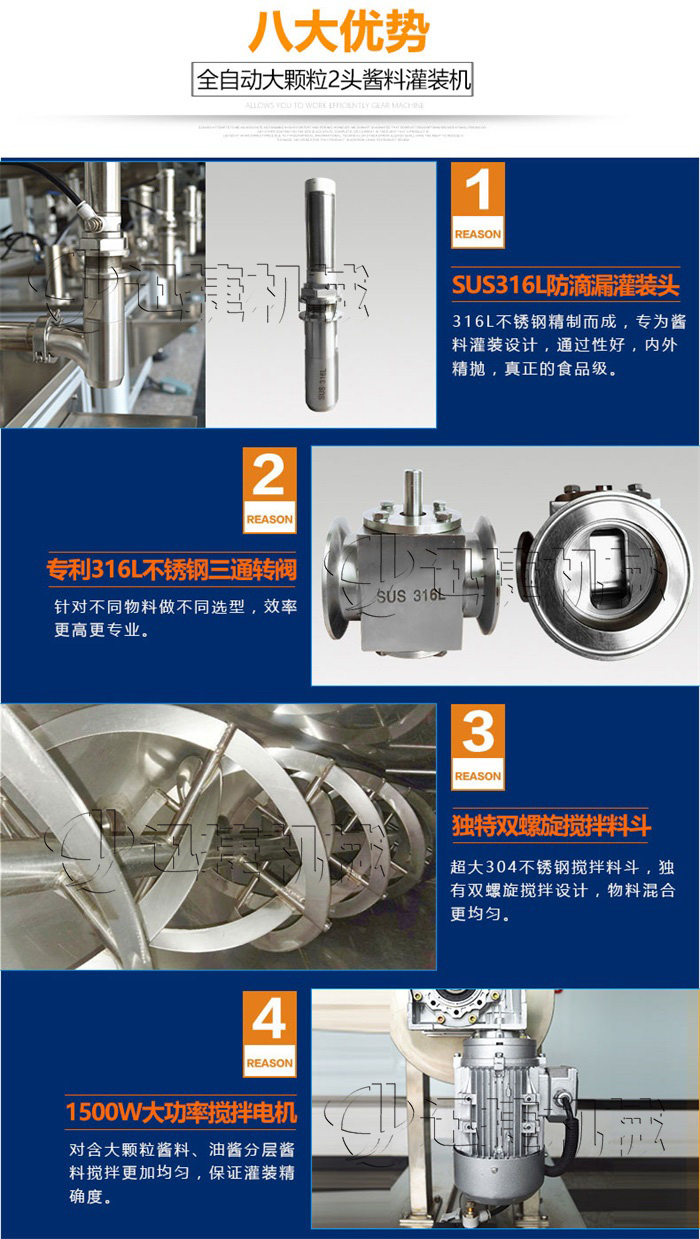 該系列灌裝機采用活塞式氣缸氣動原理,適用于調味品中帶顆粒并且濃度較大的香菇醬、辣椒醬、豆瓣醬、花生醬、芝麻醬、果醬、牛油火鍋底料、紅油火鍋底料等較為粘稠醬類的灌裝。灌裝轉閥可以很具客戶物料定做加大,以適應不同客戶物料的灌裝需求。